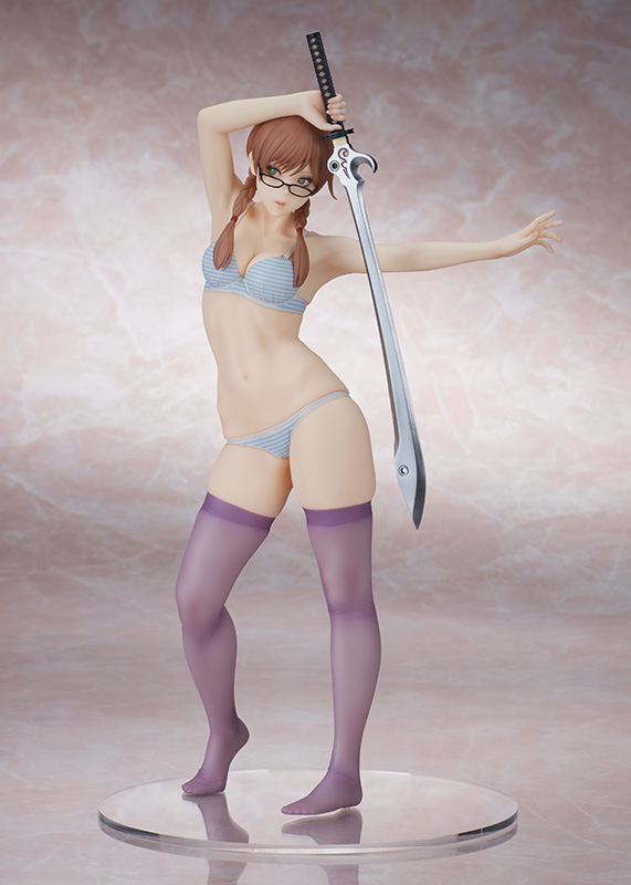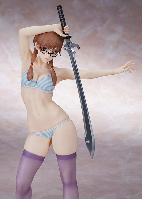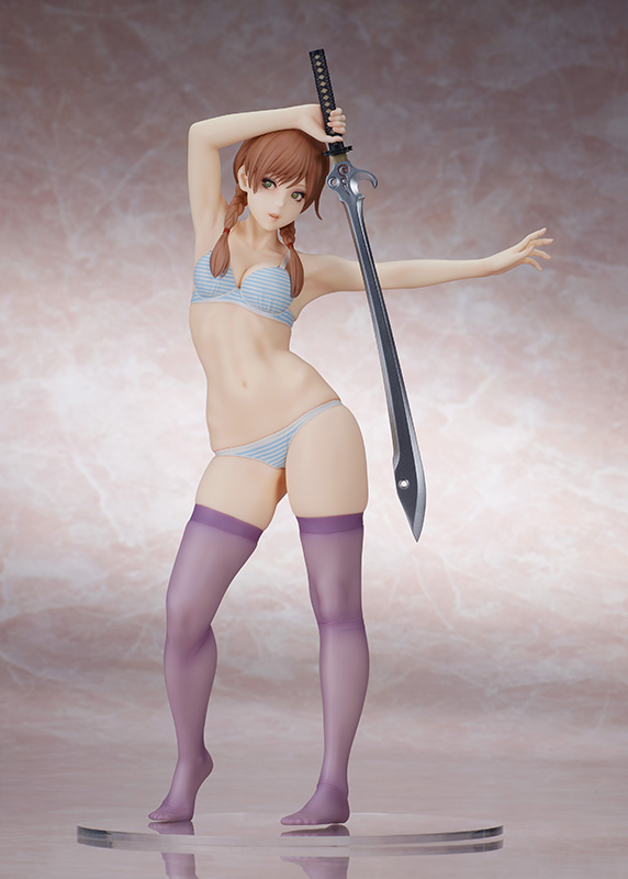 愛くるしい表情もさることながら、水着姿は繊細に作り込まれた美麗な肉感表現が最大の見どころとなっております。差し替えボディパーツにより、セーラー服ニーソ姿で刀を携えたアイコニックなスタイルも楽しめる魅惑的なフィギュアとなりました。