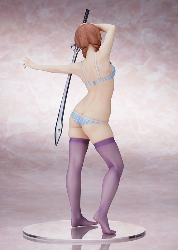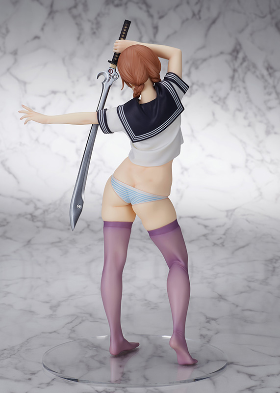 愛くるしい表情もさることながら、水着姿は繊細に作り込まれた美麗な肉感表現が最大の見どころとなっております。差し替えボディパーツにより、セーラー服ニーソ姿で刀を携えたアイコニックなスタイルも楽しめる魅惑的なフィギュアとなりました。